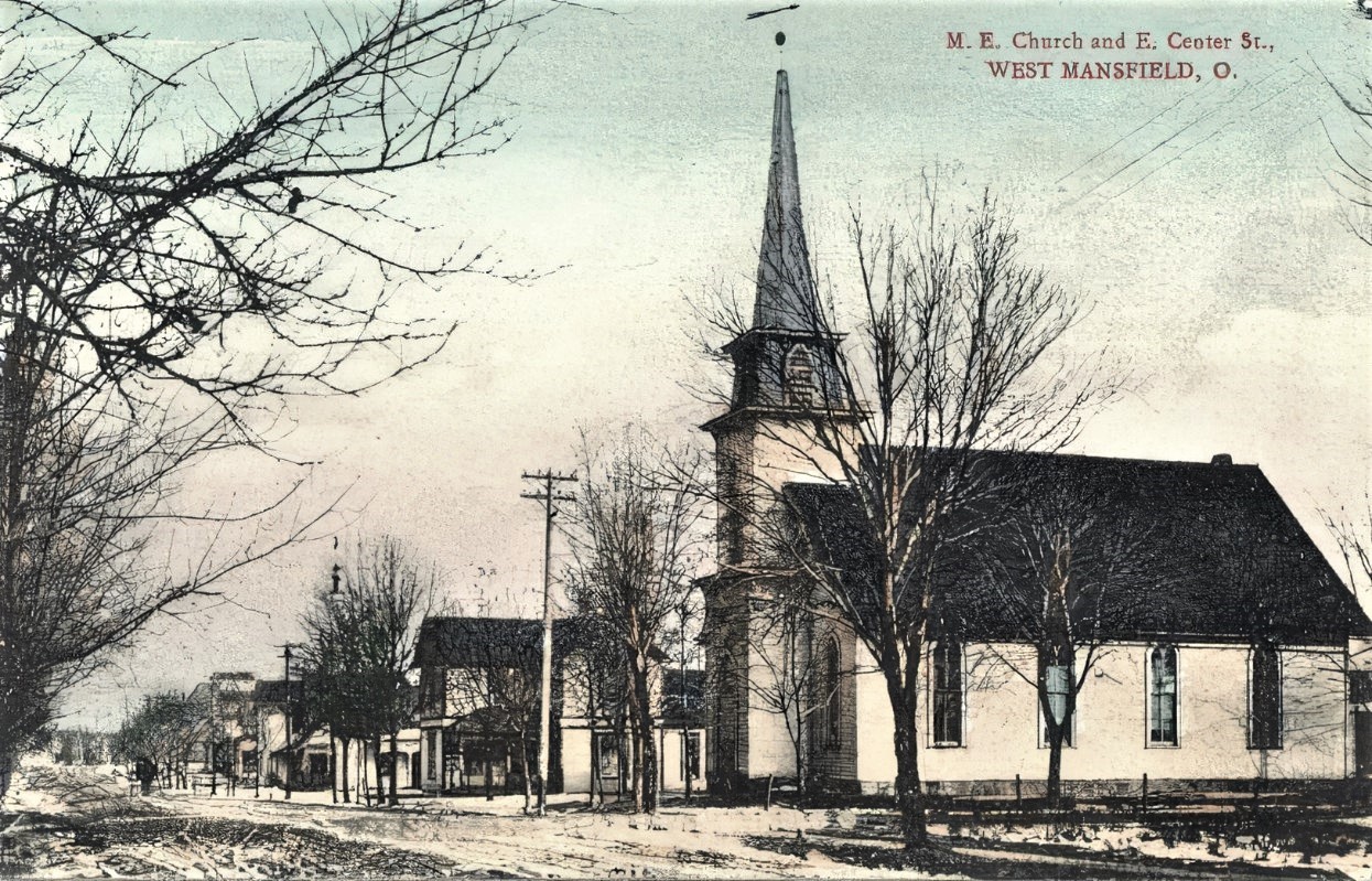 The first house in West Mansfield was built by Bliss Danforth. It was made with round logs eighteen by twenty feet, one story and covered with clapboards. The next two houses were built by Ellis and Henry Baldwin. The first tavern was kept by John Coussins. Samuel Danforth and William Keller ran a store that sold “notions of all kinds and groceries”. James Wilgus had the first shoe shop, Mark Austin and John Coussins operated blacksmith shops. John Robinson was the first Postmaster. Mail was transported from Bellefontaine to West Mansfield daily.